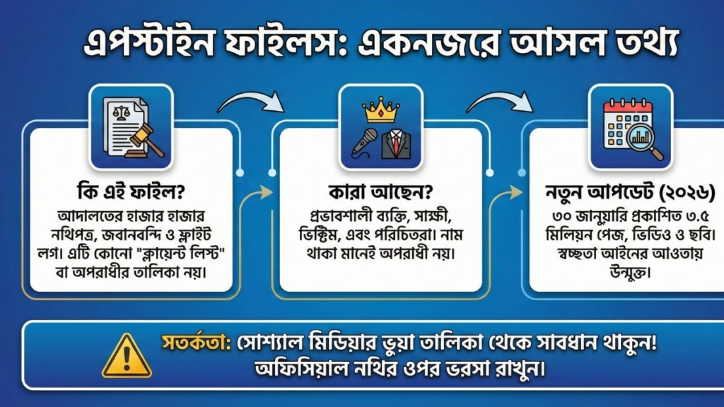 এপস্টাইন ফাইলস কোনো গসিপ বা গুজব নয়, এটি একটি গুরুতর আইনি দলিল। ইন্টারনেটে ছড়ানো চটকদার ভিডিও বা পোস্ট বিশ্বাস না করে, মূল ধারার গণমাধ্যম এবং আদালতের তথ্যের ওপর নির্ভর করাই বুদ্ধিমানের কাজ।